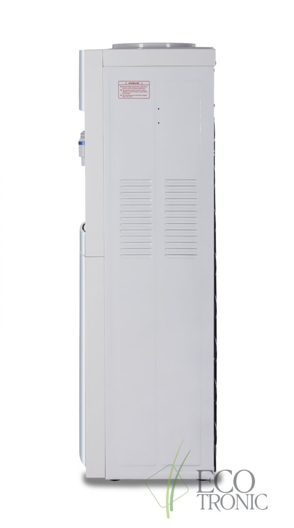 Кулер «Экочип» V21-L white+silver. Бюджетный аналог классической модели Ecotronic Н1. Напольный кулер белого цвета с серебристой вставкой. Компрессорное охлаждение. Тип кранов подачи воды — «Нажим кружкой».